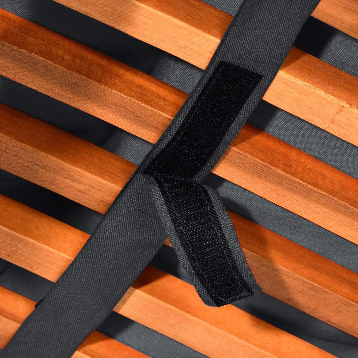 Op de achterkant van de bovenste rugleuning en het onderste gedeelte bevindt zich telkens 1 bevestigingsband in de juiste kleur, waarmee het dekstoelkussen zeer eenvoudig kan worden bevestigd.