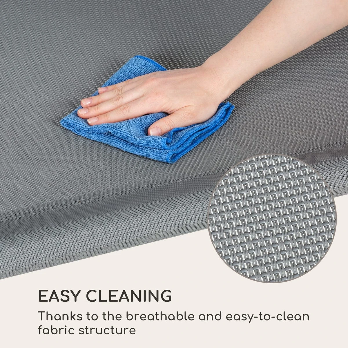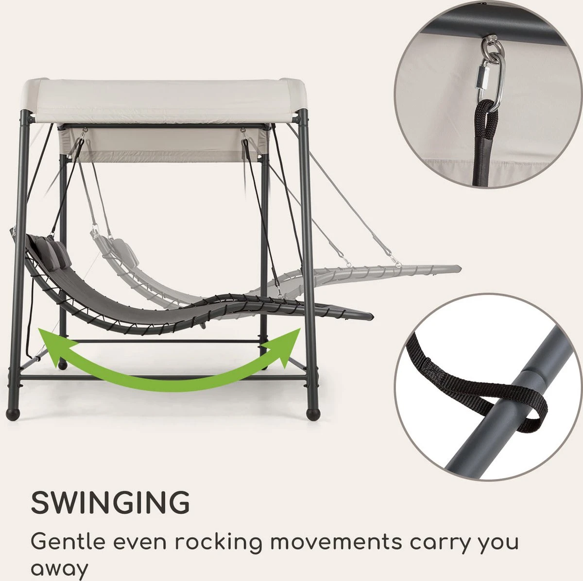 Het robuuste stalen frame geeft het blumfeldt Palermo tweepersoons schommelbed op elk moment de nodige stabiliteit en draagt moeiteloos bij aan je welverdiende ontspanning na een stressige dag. Gewoon achteroverleunen, ontspannen en wegdommelen bij de zacht schommelende bewegingen. Het ligvlak van ademend en eenvoudig te reinigen materiaal is niet alleen bijzonder resistent, maar biedt ook een royaal oppervlak van 130 x 207 cm (BxD) en veel plaats voor gezellig samenzijn. Voor individueel comfort zorgen de twee in hoogte verstelbare hoofdkussens. Het elegante design en de klassieke kleuren introduceren een vijfsterrengevoel bij je thuis. Het grote zonnedak van 200 x 144 cm (BxD), gemaakt van 180g/m² polyester, zorgt betrouwbaar voor schaduw en beschermt je zelfs tegen een regenbui. Schroeven van edelstaal garanderen daarnaast de duurzaamheid van de constructie. Het maximum gewicht van 45 kg en de 4 poten zijn verantwoordelijk voor extra veiligheid en stabiliteit.