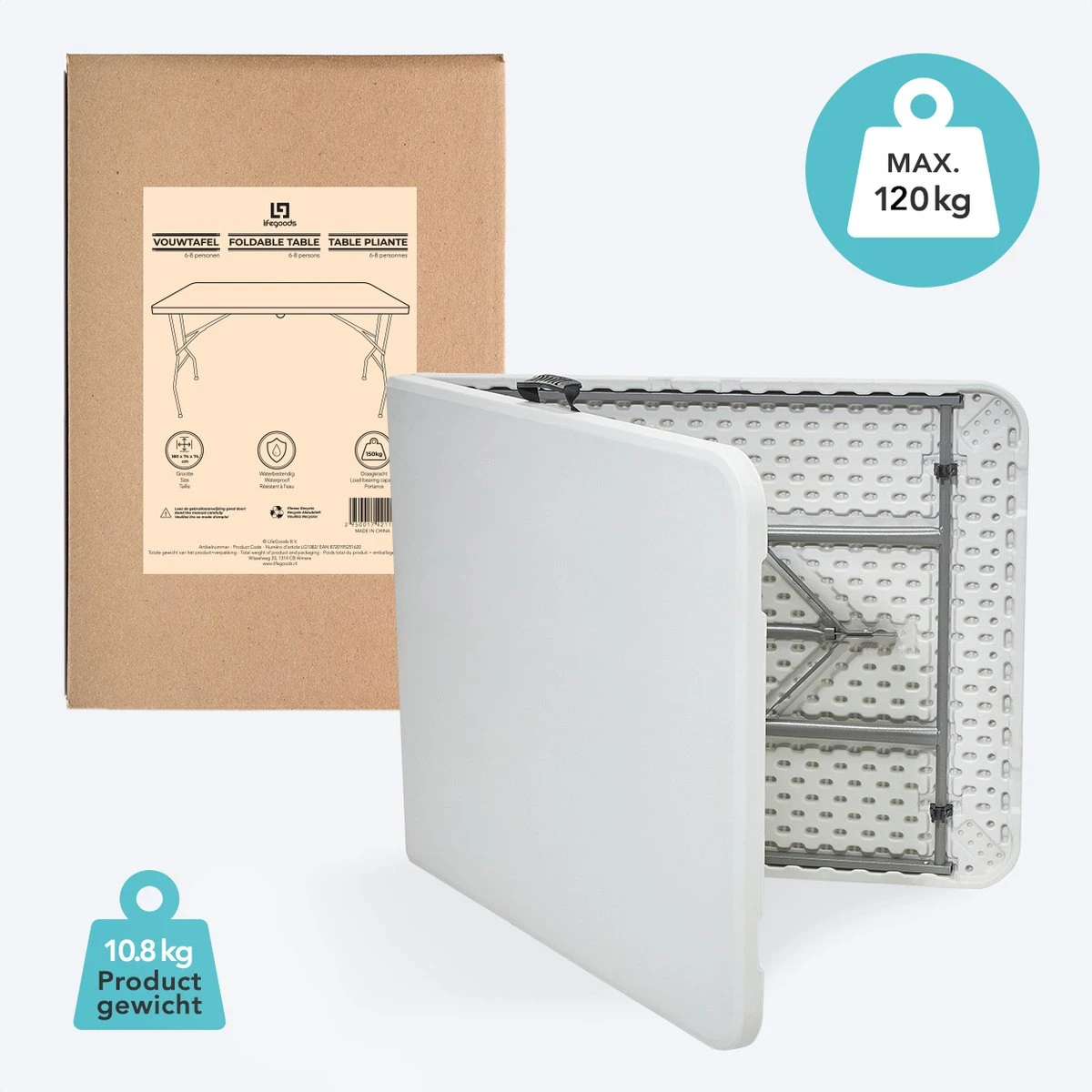 - De opvouwbare tafel is gemaakt van HDPE kunststof en bevat gerecyclede materialen. Mede hierdoor heeft het blad van de tafel een gemêleerde witte kleur (deze is dus niet effen wit).