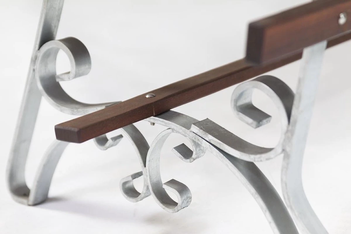 De tuinbank is verstevigd met een stalen onderstel bestaand uit een 10 x 30 mm thermisch verzinkte strip met voorgeboorde gaten voor eventuele grondverankering. Het onderstel van de tuinbank is verzekerd met slotbouten uit roestvrij staal.